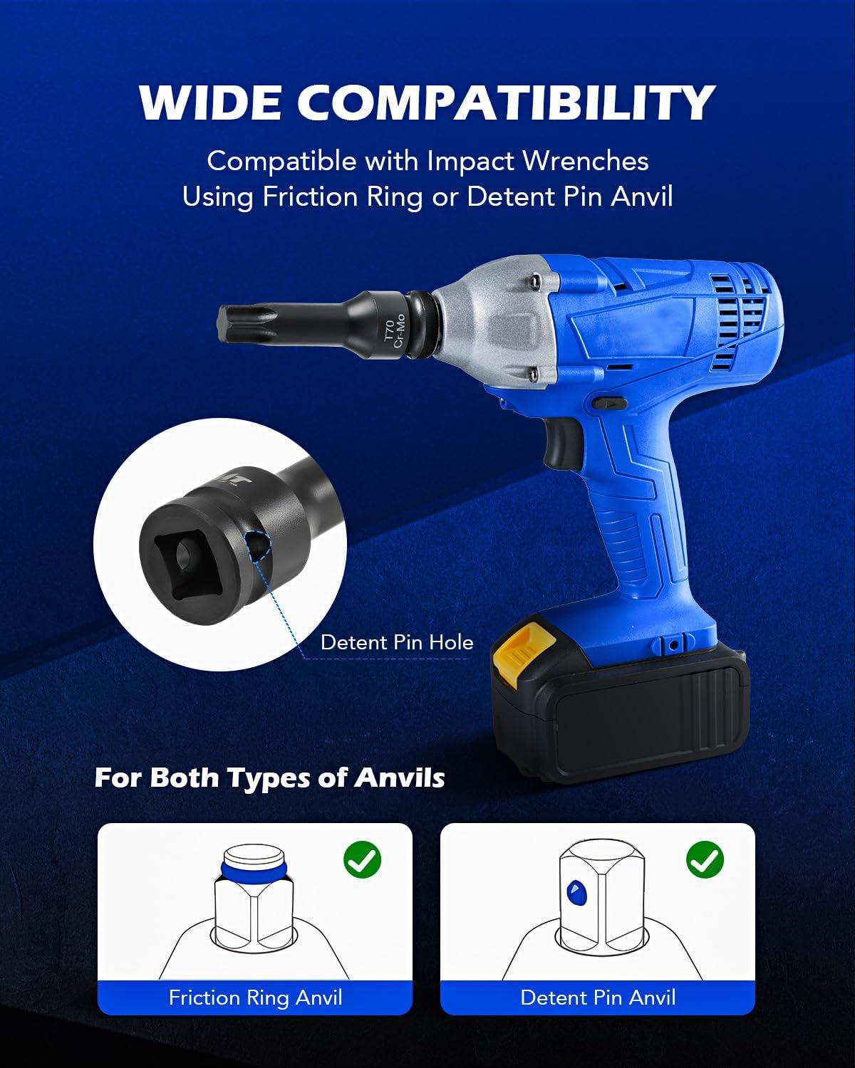 Work in Confined Spaces: These Torx bit sockets effortlessly handle components in tight spaces, thanks to their extended lengths. They also work perfectly with impact wrenches using a friction ring or detent pin anvil.
