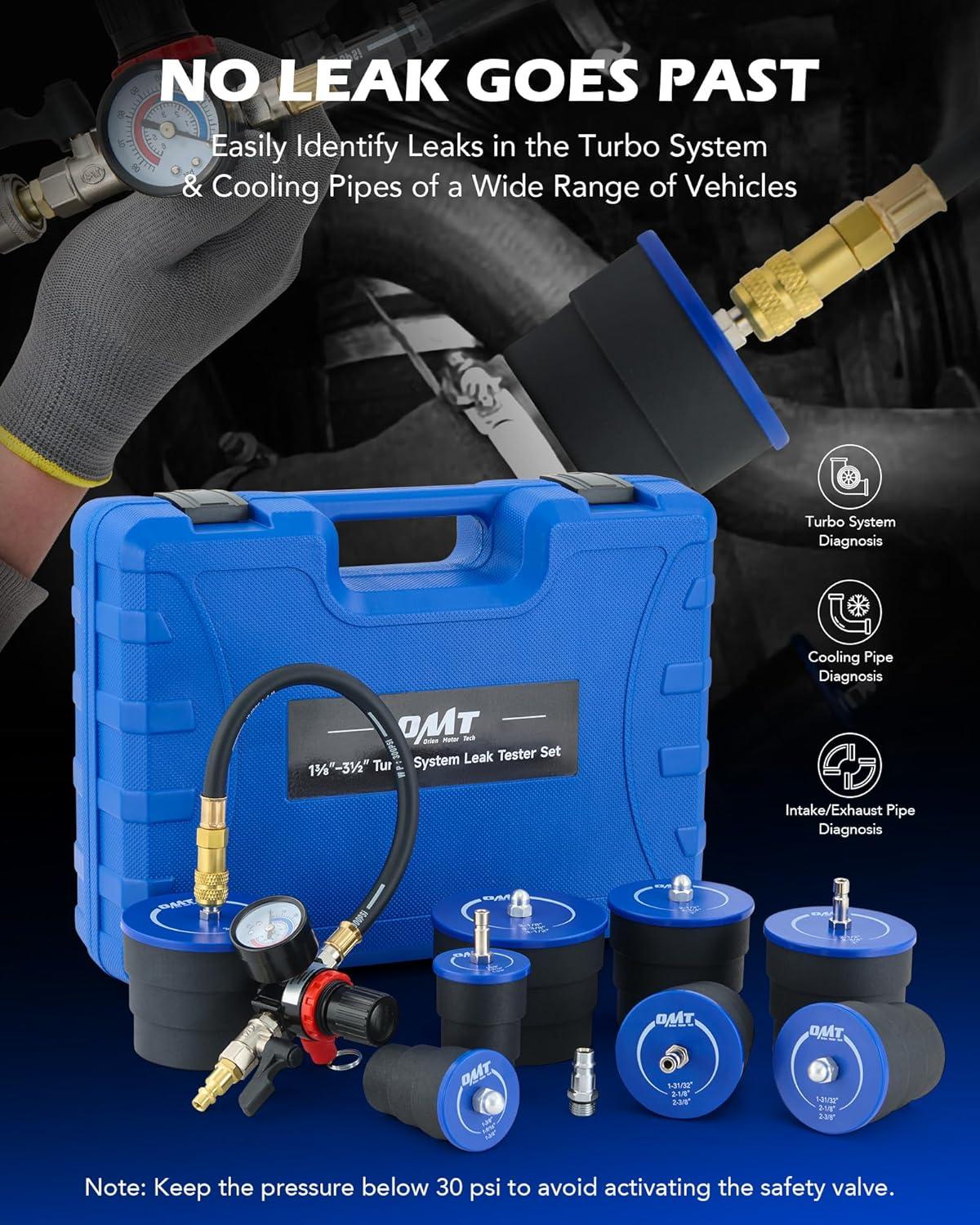 Troubleshoot Turbo Leak with Ease: Orion Motor Tech's turbo pressure tester kit simplifies the process of checking and identifying leaks in the turbocharger, cooling, and emissions systems of various cars and light trucks