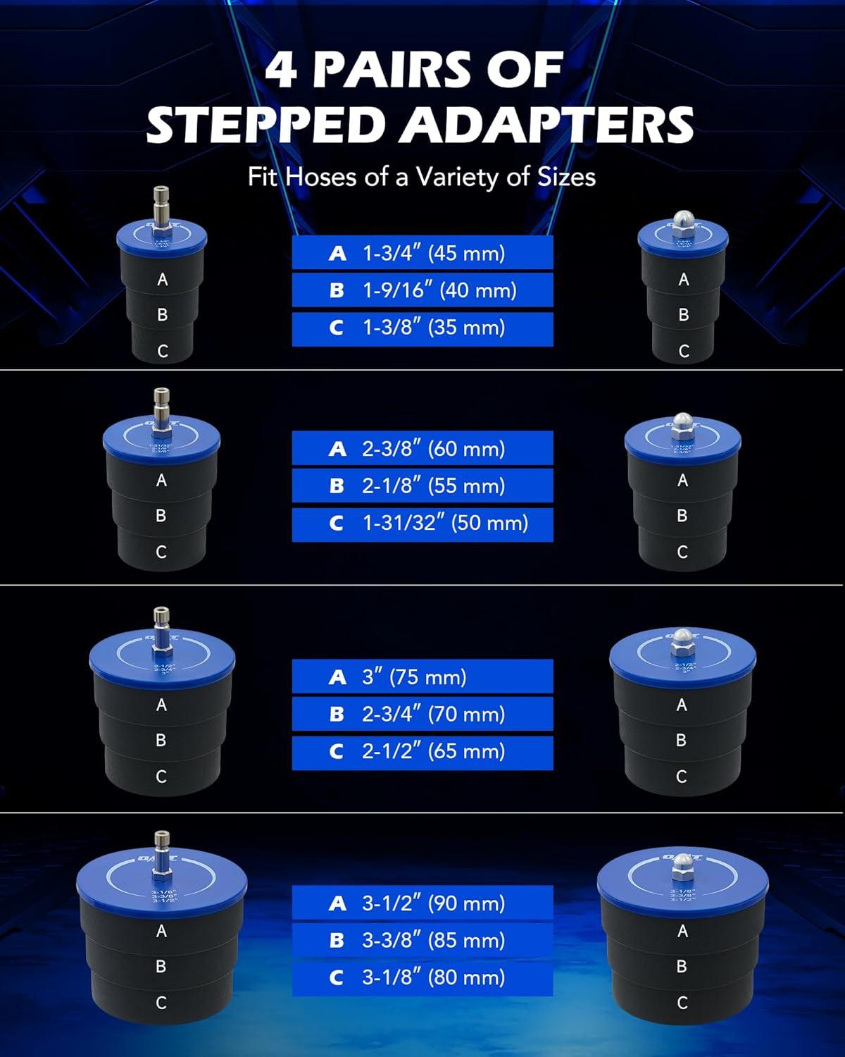4 Pairs of Stepped Adapters: The outer diameters for each pair are as follows: 1-3/8″, 1-9/16″, 1-3/4″; 1-31/32″, 2-1/8″, 2-3/8″; 2-1/2″, 2-3/4″, 3″; and 3-1/8″, 3-3/8″, 3-1/2″, providing full coverage and ensuring a secure fit on hoses of different sizes